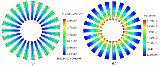 Stress analysis of modulator teeth: (a) stress; (b) strain.