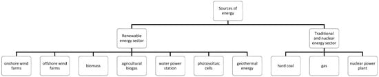 Traditional sources of energy such as coal, oil, and gas emit considerable amounts of greenhouse gases and particulates when burned. The use of renewable energy instead of fossil fuels facilitates the reduction of excessive environmental pollution. Globally, there is an ongoing trend of modernization and adaptation of technologies using renewable energy sources. There has been an increase in discussions about the use of waste materials in the energy production sector in recent years [1,2]. General energy sources classifications [3] presented in few doctoral thesis [4] allow for the identification of non-traditional power sectors (renewable sources of energy), traditional power sectors (gas, coal), and nuclear energy. Renewable energy sources also include wind power, waterpower, solar power, geothermal power, biogas, and biofuels. The classification of energy sources according to their origin and ability to be acquired is presented in Figure 1.