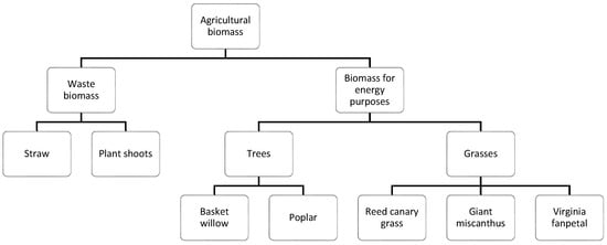 Solid biomass of agricultural origin is acquired in agricultural areas. Despite crops being grown for energy purposes, undoubtedly a larger proportion of solid biomass comes from agricultural waste, especially from the surpluses and the residue produced during agricultural production. Depending on the source of origin, biomass can be divided into agricultural waste (e.g., straw and shoots) or that grown for energy purposes. The classification is presented in Figure 2.