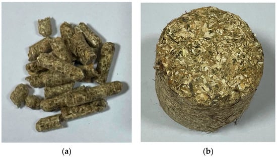 The raw material that the pellets and briquettes were made of for the test was supplied by a company called Cannabotanique. The samples were prepared using hemp stalks that were 1.5 to 2.5 m high. The hemp that was used in the research was grown in Poland, more specifically in the Mazowieckie Voivodeship, where it was grown on a plantation situated in the center of the community. In Poland, hemp (Cannabis sativa L.) grown on a plantation is regulated to include no more than 0.2% THC. Throughout its cultivation, this plant was subjected to temperate climate conditions. During the cultivation period, the average daytime temperature fluctuated in the range of 15–24 °C. The harvesting of the crops was carried out using agricultural machinery that was specially designed to harvest mature crops. The pellets and briquettes used in the research are presented in Figure 3.