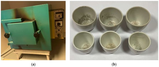In order to determine the amount of ash in the raw material, the prepared samples were incinerated. It appears that the measurement of ash is an important step in determining the chemical composition of solids. The iron, silicon, aluminum, magnesium, calcium, sodium, and potassium content can all be measured in relation to mineral saturation [23]. Measurements of ash are carried out after samples have been burned, following a systematic process that involves several steps that must be repeated consistently and correctly. The first step in preparing an ash sample is to burn the substance in a controlled environment to remove any contaminants. In order to determine the weight of the ash produced, a scale should be used. The methodology also includes calibrating and controlling the apparatus used for analysis. The calibration of apparatus is necessary for accurate and precise measurements. Temperature and duration should be kept constant to ensure a standard operating environment. Controlling these parameters is essential for the repeatability and reliability of measurements. The muffle furnaces used for ash content measurements and samples created during the burning process are also presented in Figure 4.