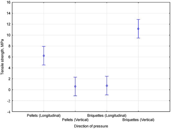The average compressive strength of the solid biofuel when applied to different directions of pressure was further analyzed statistically. The distribution of stresses defining strength varied depending on the positioning of the solid biofuel. There were some cases where the decline was more pronounced than in others. Statistics showed that, in some cases, there was a significant variation in the measured parameters along with a correlation between them. It was found in most cases that there was a significant effect of correlation between the examined indicators on the correlations, which was further confirmed by a statistical significance value of p = 0.131. It has been found that the empirical value of F(3, 8) is 46,545.