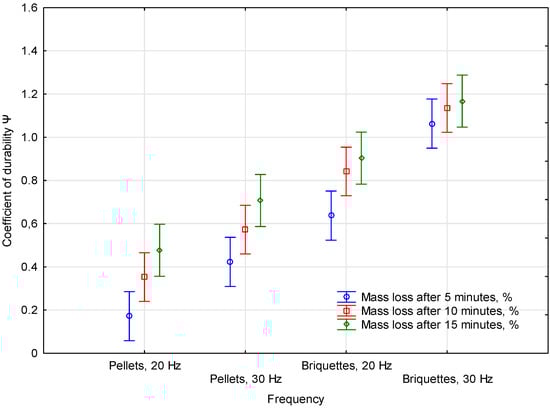The strongest coefficient of durability, Ψ = 1, was recorded for pellets produced from hemp, which had the biggest quality factor. This meant that there was no shattering, or that only a small amount of shattering occurred in the solid biofuel during the durability test. Due to its size, the blend contained a significant amount of fine fractions, which probably positively affected the quality of the pellets. A coefficient of durability of 0.988 was obtained from briquettes produced with a higher proportion of fractions ranging from 0 to 10 mm. The statistical characteristics of mass loss after 5, 10, and 15 min at 20 and 30 Hz are presented in Figure 8.