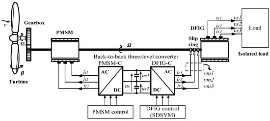 A representation of the standalone WECS when feeding an isolated load is given in Figure 1. It is composed of a small-scale wind turbine coupled to a Permanent Magnet Synchronous Machine (PMSM) and DFIG through a gearbox. The back-to-back three-level NPC converter is connected to the PMSM to provide the appropriate DC link voltage, and it is also linked to an isolated load that provides the required supply of electricity. Thus, the DFIG-side converter controls the frequency and magnitude of the stator output voltage of the DFIG in order to ensure a continuous AC supply for the three-phase load, whereas the PMSM-side converter controls the DC link voltage. This paper deals mainly with DFIG control via a three-level NPC converter, focusing on the application of the proposed SDSVM technique. Thus, the next section concerns the modeling of both the three-level NPC converter and the DFIG.