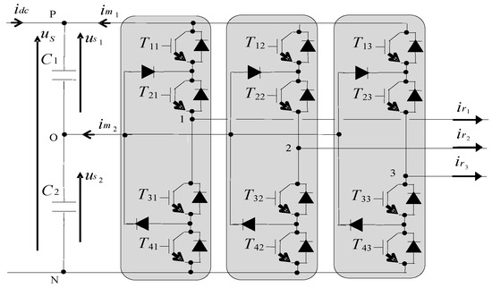 Figure 2 demonstrates the structure of the DFIG-side three-level NPC converter, which consists of three commutation circuits fed by a capacitive voltage divider. The voltage across the two capacitors, us1 and us2, must be controlled to be equal to half the value of the full DC voltage us to ensure the good operation of the NPC converter.