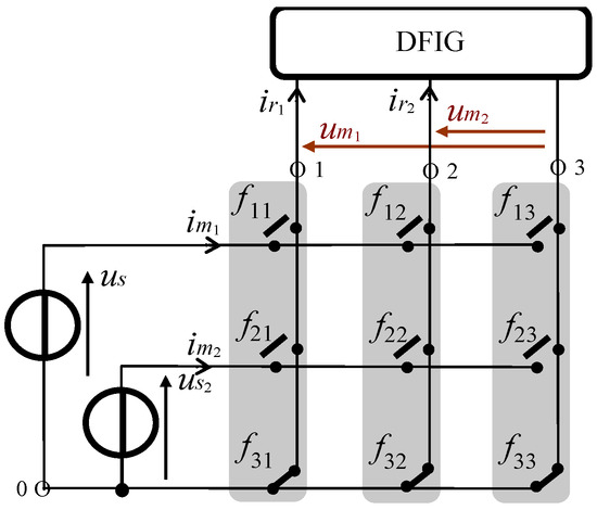 The switch states are modeled using switching functions (frc). The index r corresponds to a row, and c corresponds to a commutation circuit. If frc = 1, the corresponding ideal switch (and so a corresponding transistor) is closed. Otherwise, if frc = 0, it is open. Thus, switching functions in the equivalent commutation circuit depend on transistor gate signals, as follows: