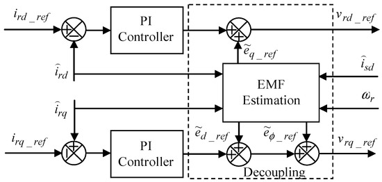 The second stage is devoted to the rotor current controller. The rotor currents of the DFIG are sensed and transformed to the dq reference frame by using a Park transformation. Then, their control is ensured using two PI controllers (Figure 7) after they are compared to their references. The d and q components of the DFIG rotor voltage reference vrd_ref and vrq_ref are thus evaluated (Figure 7). Thanks to the modeling provided by Equation (19), the emf coupling of ẽd_ref, ẽq_ref, and ẽΦ_ref are estimated from the measured rotor and stator currents of the DFIG, rotor current pulsation ωr and estimated d component of the stator flux , as follows: