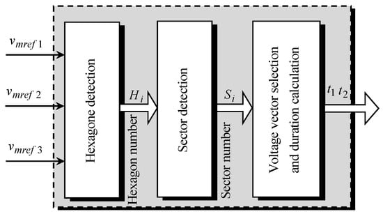 The proposed SDSVM strategy has to control the three-level NPC converter in the line-to-line (um1, um2) reference frame. The global schematic of the SDSVM (Figure 8) consists of three blocks: hexagon detection, sector detection, and voltage vector selection and duration calculation.