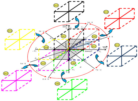 Then, the space vector diagram in the frame (um1, um2) is divided into six hexagons (H1–H6) (Figure 9).