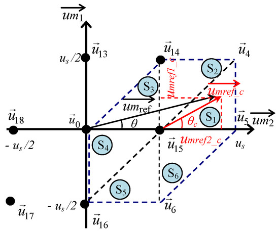 Once the hexagon is identified and the voltage vector corrected, the sector should be identified in the same way, according to the angle between the um2-axis and the new reference voltage vector (Figure 10). Thus, six triangular sectors (S1 − S6) can be distinguished.