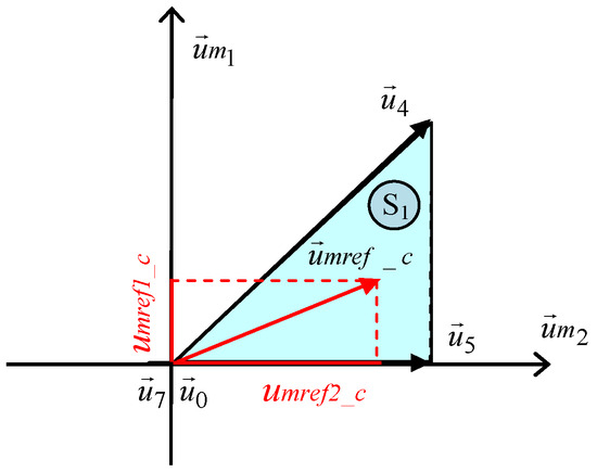The duration of each vector is determined by the obtained projections onto the frame vectors (um1, um2). For example, for a desired modulation vector located in sector S1 (Figure 11), the three selected vectors are , and . Their respective durations (t1, t2, and t0) and the modulation time Tm are expressed according to the following: