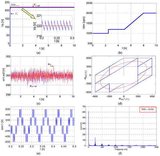 Figure 12a shows that the overall WECS system is well controlled since the measured output voltage is well regulated to its reference despite variations in the rotating speed of the wind turbine, which varies from 1000 rpm to 2000 rpm (Figure 12b). The good regulation is confirmed by the small value of the mean square error of the observed variable Vs with respect to the reference Vs_ref, which is equal to 0.25. The voltages us1 and us2 across the capacitors C1 and C2 are equal (Figure 12c); hence, the DC link voltage is balanced. This result confirms that the proposed SDSVM scheme adheres to the redundant converter switching states. Figure 12d displays the reference-modulated voltages and the voltage vectors used for the three-level NPC converter that are drawn in the plan (um1, um2). Figure 12e,f illustrates the modulated line-to-line output voltage of the three-level NPC converter and its respective single-sided amplitude spectrum. The calculated THD of the modulated line-to-line output voltage is −30.034.