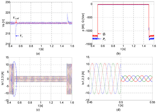 In order to test the robustness of the overall control system, Figure 13 demonstrates the simulation results of standalone WECS control with load variation. In fact, a scenario that simulates the connection and disconnection of a second load at times t = 0.5 s and t = 1.5 s, respectively, is considered. Figure 13a shows that the DFIG stator output voltage is well regulated even during the connection or disconnection of other loads. Figure 13b illustrates the active and reactive powers produced by the DFIG and consumed by the three-phase load during this transient time. The three-phase load currents and also their zoom are displayed in Figure 13c,d. The results presented in this figure prove the robustness of the overall control system, even with load variation.