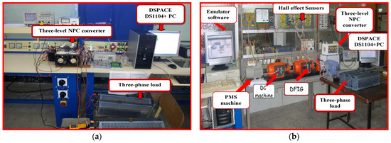 A laboratory experimental test bench was built (Figure 14) to confirm the validity of the proposed SDSVM technique in controlling a three-level NPC converter supplying a simple three-phase load (Figure 14a). Then, this technique was implemented to control the voltage and frequency of the whole standalone DFIG-based WECS (Figure 14b), which consists of a wind turbine emulator based on a torque-controlled DC machine, a PMSM, a DFIG, and a three-level NPC converter. The last component was designed for 6 kVA drive operation, with 400 V, 50 Hz AC, and a DC voltage of us = 250 V with 1500 µF/350 V capacitors. The power modules were two bridged insulated gate bipolar transistors (IGBTs), which were packed into one module. Hall effect sensors were used to sense the required currents and voltages for the control method. The proposed SDSVM technique, as well as the standalone DFIG-based WECS control strategy, were both implemented on a dSPACE DS1104 board.