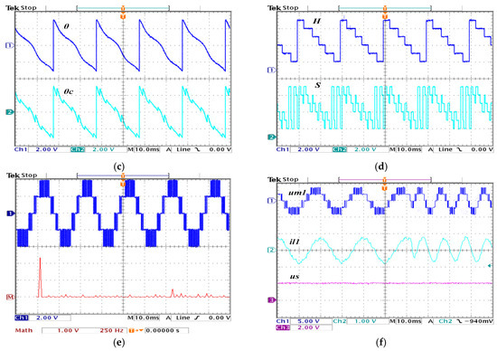 Figure 15 displays the experimental results of the three-level NPC controlled by the proposed SDSVM supplying a three-phase load. Figure 15a displays the modulated line-to-line voltages um1, the modulated line-to-neutral voltage vm1, and the load current iL1. Figure 15b shows the evolution of the DC link voltage us as well as voltages us1 and us2 across the upper and lower capacitors during the balancing procedure. It can be clearly seen that after time t1 (the beginning time of the balancing procedure execution), the voltages of both capacitors converged to an equal value after 400 ms. This is due to the capability of the proposed SDSVM to adhere to the redundant NPC converter switching states. The angles θ (between the um2-axis and the reference voltage vector umref) and θc (between the um2-axis and the new reference voltage vector umref_c) are shown in Figure 15c. In addition, Figure 15d shows the hexagon and the sector in which the voltage vector reference tip is located. It is clearly shown that hexagon H and sector S have a staircase shape and, therefore, the reference voltage vector will certainly sweep the six hexagons and the six sectors. Figure 15e illustrates the line-to-line output voltage together with its respective single-sided amplitude spectrum. Figure 15f shows the waveform of the line-to-line voltage, load current, and DC link voltage with a step change in the frequency (from 50 Hz to 100 Hz) of the voltage reference. This result confirms the validity of the SDSVM, even during a transient state.