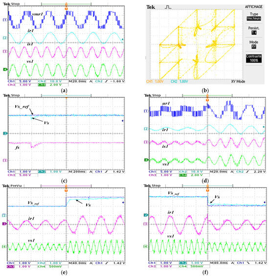 From Figure 16c, it is clear that the rms output voltage and frequency have achieved their references even with load variation. This is due to the good control of the DFIG rotor current, and consequently, the output voltage of the NPC converter (Figure 16d). Thus, these results confirm the robustness of the control system even under load variation. It was noted that due to the load change, the voltage establishment time was 50 ms, and the frequency establishment time was 80 ms. Figure 16e,f illustrates the experimental waveforms of system control during step-up and step-down changes in the rms voltage reference, respectively. Moreover, it can be clearly seen that during these changes, the regulated rms voltage follows its reference. It can also be noted that the voltage establishment time due to the step-up change in the reference voltage is 160 ms, whereas, for the step-down change, it is 160 ms.
