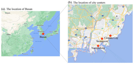 Busan (35°05′ N, 128°35′ E), located on the south-easternmost tip of the Korean Peninsula (Figure 1), is the economic, cultural, and educational center of southeast Korea. For this study, Nampodong, Seomyeon, and Centum City were selected as the targeted old, present, and new city-center sites to represent the urban development of Busan.
