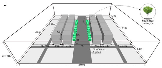 According to the field measurement results, most of the street lengths between the main intersections were approximately 150 m, with secondary or branch roads between the main intersections. As shown in Figure 2, the main model was sized at 280 × 280 m and the model height was twice the height of the highest building (h = 2Hb), where the street length was set to 154 m. The surrounding area (60–70 m) excluding the core model was set as a buffer zone, and five nesting grids were added outside the model to avoid interference from wind turbulence and unevenly distributed solar radiation accumulating near the street corner within the analysis area. On both sides of the street, 12 building units were set up, and trees were lined in two rows along the street to simplify the simulation. The street tree model was determined based on the field-measured street tree data. In different scenarios, as the Ht changed, the diameter at breast height and trunk height of the street trees were adjusted proportionally. Concrete was used for the building surfaces and sidewalks, while the surface material of the lanes between two rows of street trees comprised asphalt pavement to simulate the impermeable surfaces of the city. The surface material of the buffer zone comprised the same asphalt, whereas concrete was used for the remaining blocks.