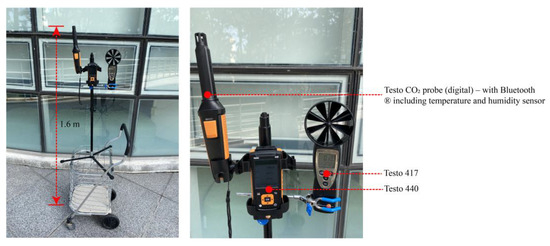 A portable weather station was set at 1.4–1.6 m above the pavement on a mobile cart to measure the log ambient TA, RH, and WVEL (Figure 3). The instrument parameters are listed in Table 6. Using the “Stop-and-Go” method [66], the mobile cart was moved as quickly as possible between monitoring points, where it was stationed at each point for 1 min, and recorded data after 1 min. This process was repeated for four monitoring points in each area during the measurement period.