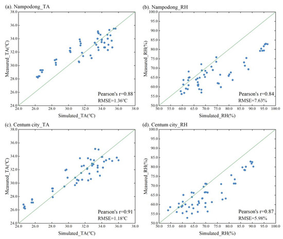 Figure 4 shows the correlations between the simulated and measured TA and RH. They are depicted using two indexes, namely Pearson’s r and the RMSE. Pearson’s r is a statistical measure used to assess the degree of linear correlation between a simulated value and a measured value. The RMSE is employed as a standard index to quantify the deviation between the simulated value and the measured value. The simulation results for Nampodong and Centum City had strong correlations with the measured results. The Pearson’s r of the TA and RH of Nampodong were 0.88 and 0.91, respectively, and the corresponding Pearson’s r values for Centum City were 0.84 and 0.87, respectively; all of these exceed 0.8. The RMSE values for the TA and RH of Nampodong were 1.36 °C and 7.63%, respectively, and these RMSE values for Centum City were 1.18 °C and 5.98%, respectively. Furthermore, based on the field measurement results, the street trees were modeled using the same approach as that described in Section 2.3.2, demonstrating the reliability of applying the street tree model to real-world scenarios.