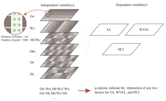 According to the GeoDetector modeling requirements, the selected 32 scenarios were arranged continuously and the factors were divided into 6 layouts. The impact of factor interactions on the TA, WVEL, and PET were analyzed. Similar to the ENVI-met model, the grid size was set to 2 m. In the 32 scenarios, excluding grids adjacent to building facades, the total number of grids was 5600 per stratum. An example of the factor layouts is presented in Figure 5.