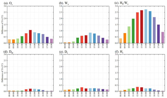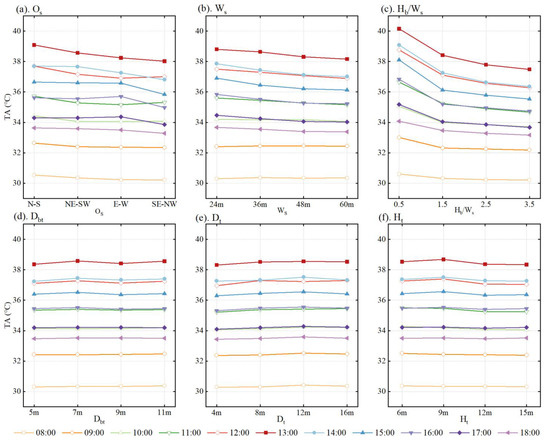 The hourly changes in TA from 8:00 to 18:00 and the results of the ANOVA are shown in Figure 6 and Table 10. The values of Os and Hb/Ws at all times and Ws after 11:00 were statistically significant (p < 0.01), indicating a strong correlation with the TA. The value of the TA for all factors was minimum at 08:00 and reached a peak at 13:00. The variation range before 13:00 was significantly greater than that after 13:00. At noon, solar radiation was strong, and the absorbed heat from buildings and the ground was released into the air through heat exchange. This had the strongest impact on the TA. Excluding the Os, only slight differences in the change curves at 12:00 and 14:00, 11:00 and 16:00, and 10:00 and 17:00 were observed. The building shadow area increased with Hb/Ws, causing the TA to gradually decrease. Particularly, the difference between Hb/Ws = 0.5 and 1.5 was the most apparent. A similar phenomenon was demonstrated by Morakinyo and Lam [31]. The increase in TA before and after the time of a street’s exposure to direct sunlight was higher than at other times (SENW was affected by direct sunlight from 10:00 to 12:00, and the change there was higher than that in other streets that were not exposed to direct sunlight). Compared with other Os values, the NS street was affected by direct sunlight at 13:00, causing heating and resulting in the highest TA. Although the SENW street was already affected by direct sunlight, its WVEL was slightly higher than that of the EW streets (see Section 3.2.2), resulting in a lower TA for SENW due to the greater intensity of convective heat transfer taking away more heat. Additionally, the WVEL increased with the gradual increases in WS, reducing the TA by enhancing the convective heat transfer intensity.