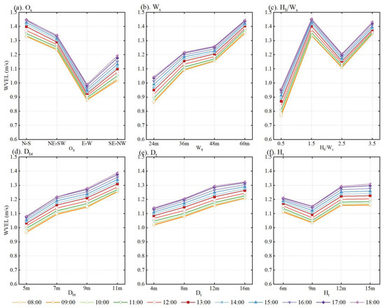 The changes in WVEL from 8:00 to 18:00 are shown in Figure 8. Since the WVEL and wind direction were not forced, the changes in WVEL at different times and scenarios were small, with a maximum of no more than 0.2 m/s. Conversely, the WVEL change trends for different factors at different times were the same. Therefore, only the data at 13:00 (typical time) were analyzed for significance, and the differences in the impacts of factor changes on the WVEL were calculated (Table 11). Changes in Os, Ws, and Hb/Ws had significant effects on the WVEL (p < 0.01), and all differences were of 0.5 m/s. The input wind direction was S–SW, and the angles between the wind direction and Os were 20°, 25°, 70°, and 65° in sequence; the smaller the angle, the higher the WVEL. The larger the Ws, the smaller the resistance encountered by the wind flow when passing through the street, and the higher the WVEL. When Hb/Ws was <1.5, the street canyon had a significant acceleration effect on the WVEL. When Hb/Ws exceeded 1.5, the WVEL decreased initially and then increased owing to the effect of downward wind.