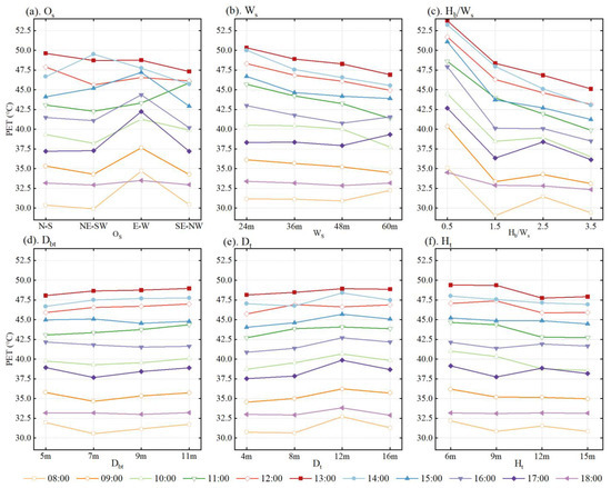 The hourly results for the PET changes and ANOVA from 8:00 to 18:00 are shown in Figure 9 and Table 12. The impact of street geometry factors was statistically significant between 9:00 and 10:00 and between 12:00 and 16:00 (p < 0.05). Particularly, Hb/Ws was statistically significant (p = 0.000) at all times, indicating a significant impact of Hb/Ws. The PET value exceeded the “Very hot” standard of thermal sensitivity level during 12:00–15:00. The NS street reached the highest PET value at 14:00. The “Very hot” level of the EW street lasted 8 h, which was 2 h longer than the other orientations. The shadow of buildings reduced the PET, and radiation from the sun had a weak impact in the deep street canyons. Hb/Ws = 0.5 was greatly affected by solar radiation, and the PET rose the fastest, reaching its highest value at 13:00. From the perspective of the thermal sensitivity level, the duration of the “Very hot” level was 8 h, 5 h, 5 h, and 4 h, respectively. With the increase in Ws, the WVEL was enhanced, and more heat on the street was taken away to improve thermal comfort.