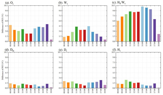 The hourly differences between maximum and minimum values from 8:00 to 18:00 are shown in Figure 10. At 08:00, 11:00, 14:00, and 17:00, the change in PET was very large due to the direct sun exposure on the EW, SENW, and NESW streets. The PET value in all orientations was greatly enhanced due to the high solar elevation angle at noon, and the difference was decreased. At 14:00, the improvement of Hb/Ws was approximately 2.3 times that of the Ws, and the change between 08:00 and 17:00 was relatively large. Particularly, the impact of the change in Hb/Ws on the PET was largest at 14:00, with a maximum value of 10.2 °C. Considering changes in Ws, the variable levels of PET were 4.3 and 4.5 °C at 11:00 and 14:00. Additionally, in the morning, the trees blocked solar radiation through their canopies and reduced the PET value. At noon and in the afternoon, the canopies weakened the radiation capacity. Simultaneously, the canopies released a certain amount of longwave radiation, which further weakened the cooling effect.