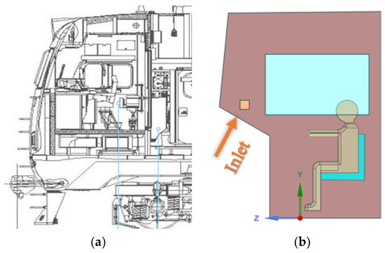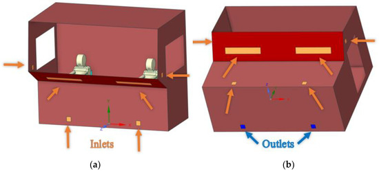Figure 2 and Figure 3 show a flat diagram and a 3D model of the cabin of the mainline freight diesel locomotive 2TE25K [74]. Air enters the cabin through the deflectors, which are shown in orange in Figure 3a, and exits through the exhaust valve located in the floor, shown in blue in Figure 3b. In this diagram, the inlet deflectors are located on the sides of the windshield, in front of the front feet, and under the windshield. Below in this work, cases of other blowing configurations are also studied.