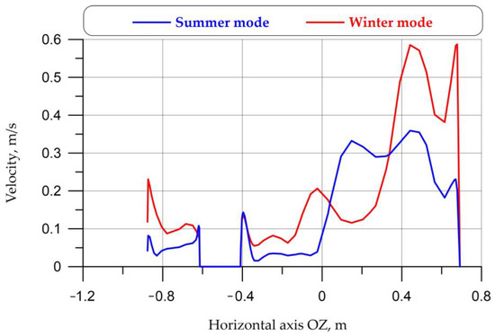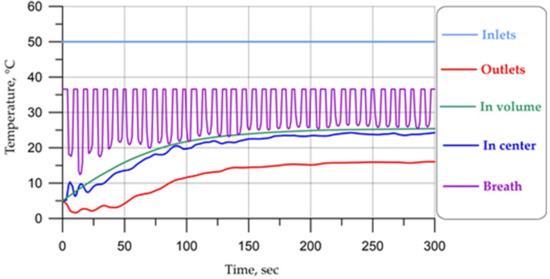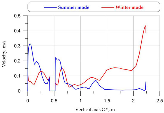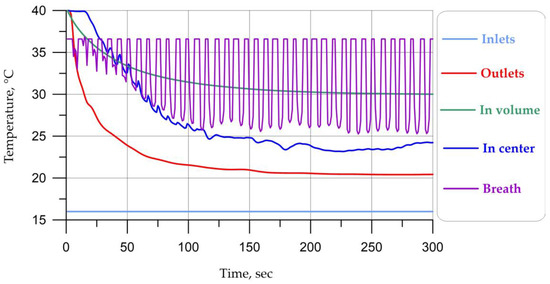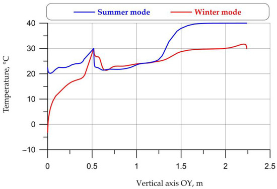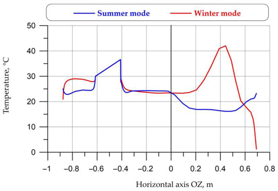 The following Figure 5, Figure 6, Figure 7, Figure 8, Figure 9, Figure 10, Figure 11 and Figure 12 show the values of solving nonstationary problems over time for the summer and winter modes. The initial and boundary conditions were set in accordance with Table 4, Table 5, Table 6, Table 7 and Table 8.