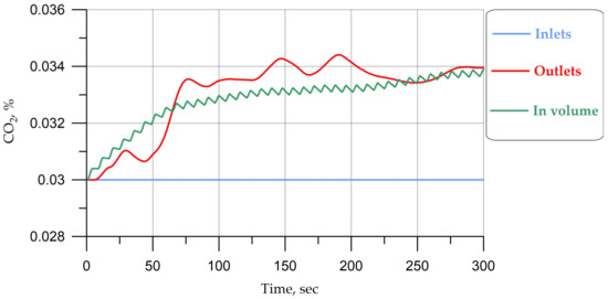 The significance of this work is as follows. The constructed numerical algorithm allows for the research and optimization of all necessary air flows inside the cabin. In particular, it allows researchers to study changes in the concentration of carbon dioxide in the cabin and in the inhaled air, including studying different degrees of air recirculation to increase energy efficiency. This model allows researchers to study the issues of the effective operation of life support systems in the absence of external air in critical situations and external air pollution, and it also allows for the simulation of the spread of harmful substances when entering the cabin and their effective removal.