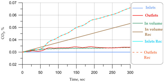 CO2 concentration values over time in summer mode on the indicated surfaces, as well as for recirculation mode.