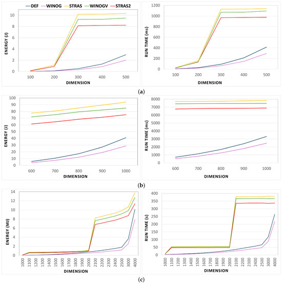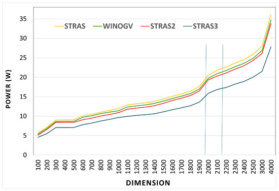 Table 6 presents the main average power and energy consumption results (figures rounded to the first fractional digit). In the divide-and-conquer methods, lines indicate cases that share the same power of two matrix sizes, e.g., dimensions 300–500 upscaled to 512. These boundaries also mark very dense matrices for those methods. For brevity, runtimes will appear in a later figure set. Each power and timing data point is an average of multiple runs with bit-randomized datasets, as detailed in the previous section, to eliminate noise from the runtime environment. The power figures were based on spot averages reported by the profiler from the sensors for each run (a lightweight rapid sampling over the runtime interval [28]). The energy figures were calculated from average runtimes based on the times reported by the profiler and the average power figures. The table omits energy data for STRAS3 since it is a simulation of block behavior, which primarily affects power consumption. Its time and energy data will not be realistic and, therefore, not comparable to the other cases. The readings at dimension 50 (64 for the divide–conquer) seemed anomalous. The very short runtimes may interfere with the internal sampling process. It is safe to ignore that point as an outlier. For reliable instrumentation in tiny cases, readings should be from an average of repeated runs.