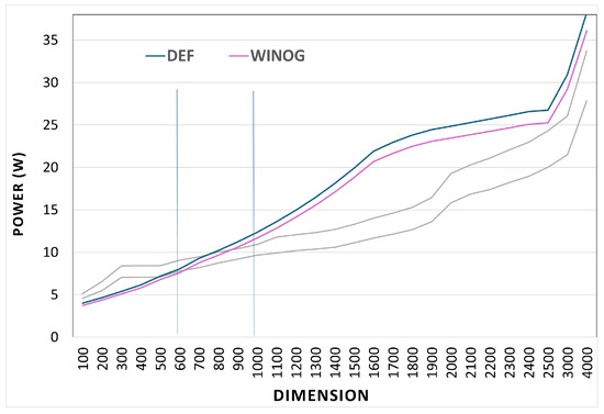 Figure 4 shows WINOG to be consistently more power efficient than DEF (6% on average), as expected given the relatively reduced use of the typically power-hungry multiplication hardware. This edge may also explain why the payoff in overall energy consumption was greater than that in the runtime, as observed earlier. Moreover, DEF and WINOG were more power efficient than the best of the divide-and-conquer group through the upper range of small matrix sizes (dimensions 500–1000), after which the trend seemed to reverse. The region over which the reversal happened corresponds to a point where the power of two matrix sizes shifts from 512 to 1024. After that inflection point, all the divide-and-conquer algorithms consumed less power. The more efficient of the group overtakes earlier after that point. From dimension 1100 forward, the divide-and-conquer method seems to have a clear power advantage. In that range (1100–4000), STRAS2 was a significant 24% on average more power efficient than WINOG. It is also evident from the performance of STRAS3 that more aggressive memory optimization may be expected to lead to even better power efficiency gains.