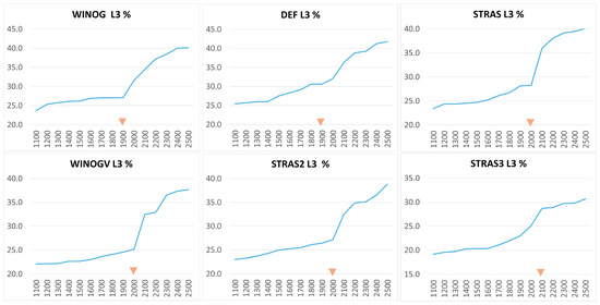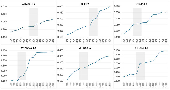 L2 cache trends, in Figure 8, proved to be more subtle but still discernible. As expected, the divide-and-conquer methods tended to miss significantly out of L2 earlier at around dimensions 700–900 compared to the other two at 1100–1200, with the memory-optimized STRAS2 and STRAS3 lingering a little longer (closer to the 900 data point). The 700–1000 range corresponded to processing matrices of dimension 1024 with an upshift to 2048 for the 1100 and 1200 points. This behavior corresponded to the second region of interest identified in the power curve from Figure 4, where power efficiency was turning away from DEF and WINOG. It seems to indicate that the computation size advantage of DEF and WINOG was no longer yielding power savings. The superior block management of the divide-and-conquer was starting to take over, perhaps. A glance at the probable region of spillover from L2 to L3 in Figure 7 reveals that it was likely where STRAS and WINOGV started to be less competitive with the memory-optimized variants in terms of memory bandwidth. It is also where WINOG is superior to DEF but starts to lose its power efficiency edge against the least-efficient divide-and-conquer methods, as Figure 9 shows.