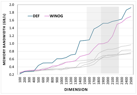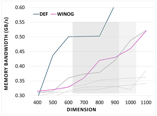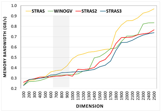 An examination of the L3 misses for the upper part of the investigated range in Figure 5 shows distinct surges around dimension 2000 (slightly later for STRAS3). Data points at 2000 correspond to dense matrices of size 2048 for the divide-and-conquer methods (sparse 3072 for STRAS3 at data point 2100). DEF and WINOG displayed similar behavior around dimension 1900. As a reminder, the data suggested that the memory-optimized divide-and-conquer showed 18–33% less power draw at the 2000 point (Table 7) relative to WINOG. The figure seems to support a probable range of spillover to DRAM between dimensions 1900 and 2100, as suggested by the energy and, to some extent, power data. Memory bandwidth data in Figure 6 also show a significant increase in memory activity in the probable region where the boundary between SRAM and DRAM may reasonably be estimated to be.