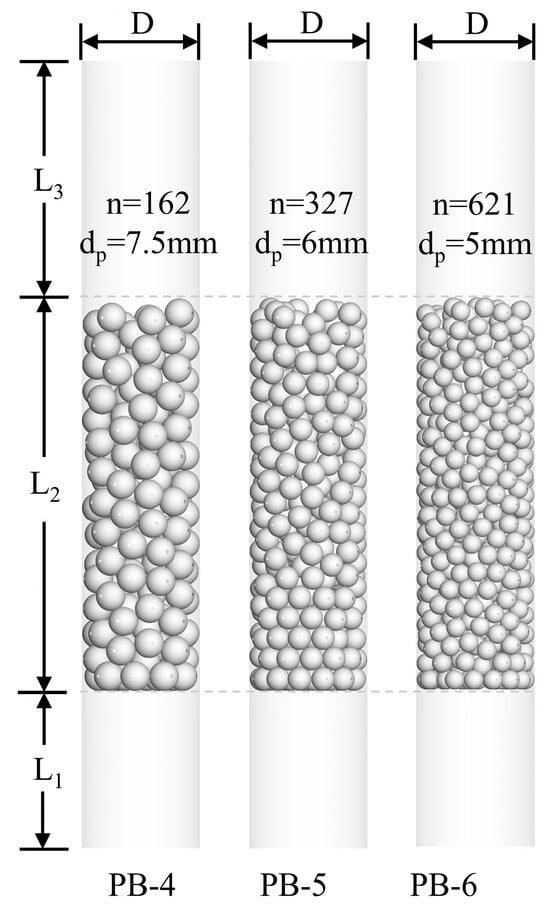 In the present study, three randomly packed beds with different D/d ratios of 4, 5, and 6 are generated (named as PB−4, PB−5, and PB−6, respectively) using the DEM. The Hertz–Mindlin model describes interactions among spherical aluminum oxide particles, including particle-wall interactions [44]. Spherical aluminum oxide particles are randomly initialized in the cylindrical packing region and fall to the bottom of the tube due to gravity. The governing dynamics for particle motion in DEM simulations are as follows: