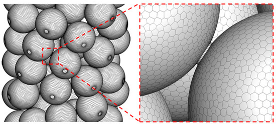 After the geometric model of the packed bed is constructed, the next step is the generation of the mesh. First, particle parameters from DEM simulations, including the centers and diameters of the particles, are imported into a CAD tool (Unigraphics NX 12, Siemens PLM Software, Plano, TX, USA). Subsequently, the re-modeled CAD geometric model is imported into a CFD meshing tool (Fluent Meshing 2021 R1, Ansys, Canonsburg, PA, USA) for mesh generation.