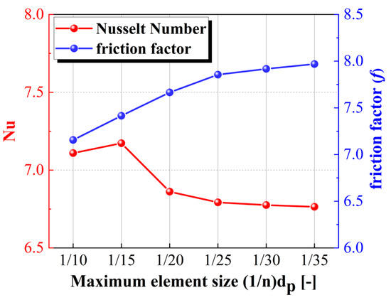 Figure 3 shows six different mesh sizes evaluated during this verification process. Following the recommendations of Dixon et al. [45], the maximum element sizes are set at 1/10, 1/15, 1/20, 1/25, 1/30, and 1/35 of the particle diameter. The figure also shows the trends in the global Nusselt number (Nu) and friction factor as functions of the mesh size. Significant fluctuations in the global Nu are observed with the larger mesh sizes of 1/10dp, 1/15dp, and 1/20dp. However, the response curve stabilizes with a mesh size of 1/25dp, beyond which changes in mesh size have negligible impact on the results. Consequently, a maximum element size of 1/25dp is selected for optimal accuracy and resource efficiency.
