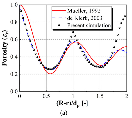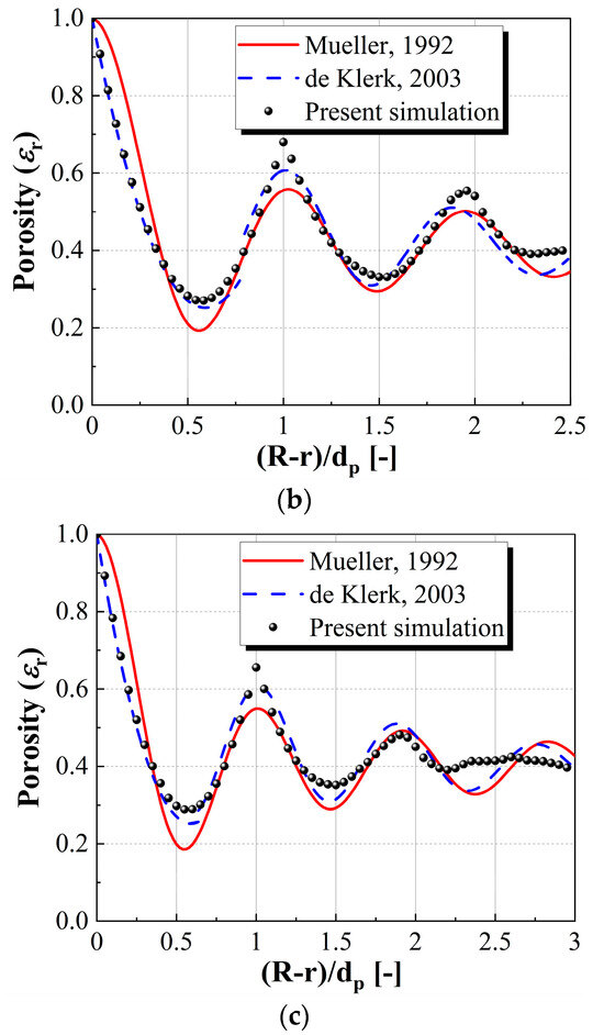 Comparison between simulation results and empirical correlations from Mueller [50] and de Klerk [51] on radial porosity distribution: (a) PB−4; (b) PB−5; (c) PB−6.