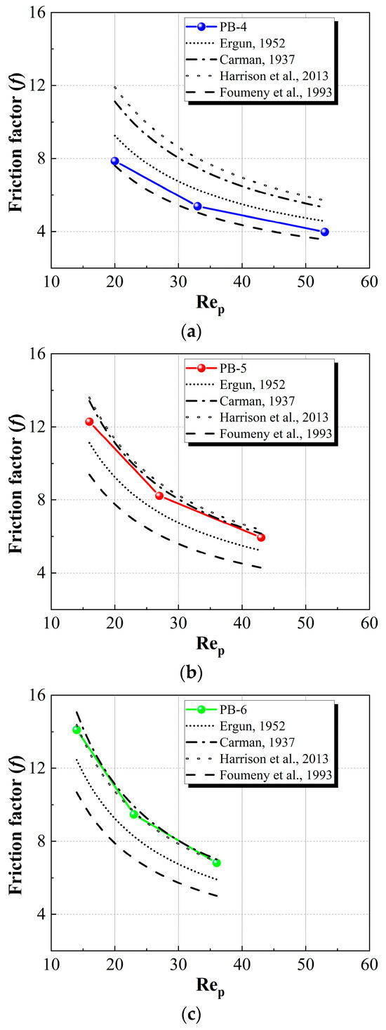 Friction factors of three packed beds with literature results from Ergun [58], Carman [57], Harrison et al. [59], Foumeny et al. [56]: (a) PB−4; (b) PB−5; (c) PB−6.