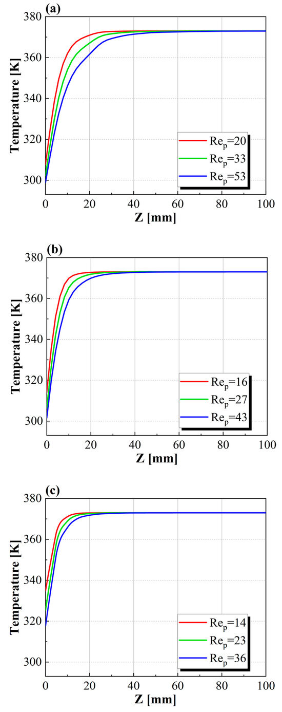 Figure 5 displays the global Nusselt number (Nu) for the three packed beds, comparing simulation results with experimental correlation predictions. It is found that the Nu curves obtained from the simulations conducted in this study are steeper compared to those reported in the literature. This discrepancy is primarily attributed to the use of hydrogen, which is characterized by a superior thermal conductivity in comparison to air (the conventional working fluid), as the working fluid in this study. Crucially, the variation in the thermal properties of hydrogen with temperature also contributes to these differences.