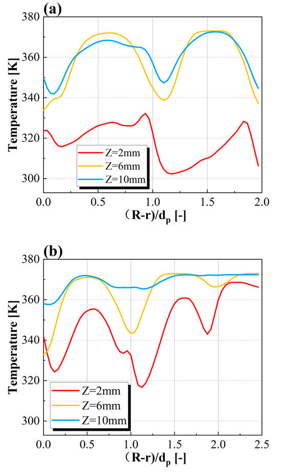 At Z = 6 mm, distinct differences in the radial temperature distribution among the three packed beds become apparent. The PB−4 model, with its smaller D/d ratio, shows a highly oscillatory temperature distribution curve. In contrast, the PB−5 model exhibits diminishing oscillation amplitude, especially near the core region. The PB−6 model shows a clear divergence from the first two, with a significantly reduced range of fluctuation and smoother oscillations.