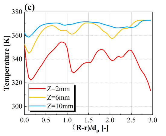 To analyze the radial temperature distribution characteristics at different heights in the inlet section of the packed bed, the cylinder is divided into three height planes at Z = 2 mm, Z = 6 mm, and Z = 10 mm, creating a series of evenly spaced radial concentric cylindrical rings. The average temperature distributions for these rings are computed for each height plane, as depicted in Figure 10.