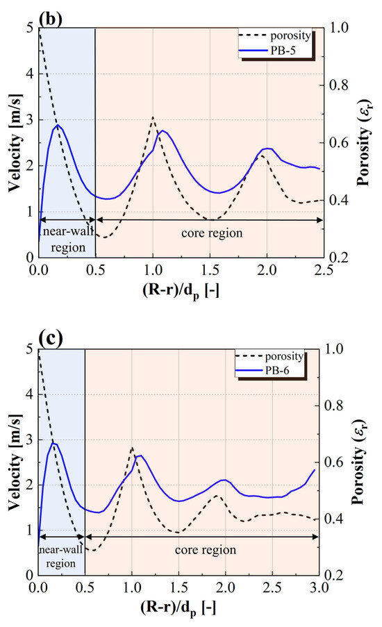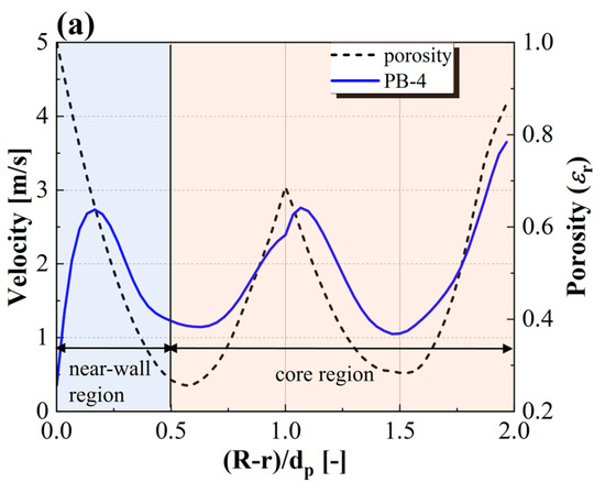 To further explore these differences, this study divides the packed bed into the near-wall and core regions along the radial direction, based on the packing structure and flow characteristics. According to Cheng and Wong [29], the near-wall region is defined as the region where (R − r)/dp ≤ 0.5, with the rest being the core region. In the near-wall region, velocity peaks at specific locations (e.g., at 0.25dp) are partly due to the velocity gradient caused by fluid viscosity right next to the tube wall and local high porosity forming flow channels. In the core region of PB−4, significant flow channels result in a notable increase in flow velocity, while the velocity fluctuations in the core regions of PB−5 and PB−6 are relatively insignificant.