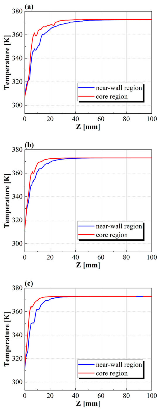 At Z = 10 mm, the temperature curves of PB−5 and PB−6 exhibit a flattened pattern, indicating a near-equilibrium state of heat transfer. Conversely, PB−4 still shows significant fluctuations, particularly in the central region. The pronounced decrease in temperature at the center of PB−4 is caused by the presence of fluid channels near the inlet, which exacerbates temperature non-uniformity and decrease the heat transfer efficiency.