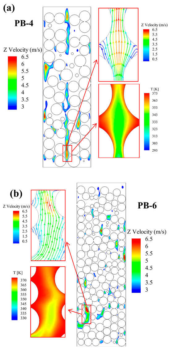 In the central region of PB−4, a large fluid channel can be found, where flow velocity significantly exceeds surrounding areas, creating a marked low-temperature zone (seen in Figure 7b) and contributing to the noticeable temperature distribution inhomogeneity. Additionally, as depicted in Figure 7a, certain flow areas, especially around particle wakes or packing region ends, display low-speed or stagnant zones. Fluid separation at the end of the packing region generates vortices that induce local negative pressure and fluid backflow. Similar low-speed areas appear in the upstream regions of spherical particles at wakes. Stagnant zones and bypass channels often form in loosely packed areas or near tube walls, causing local flow velocity spikes. These observations are typical of the flow within PB−4 as a result of the low D/d ratio.