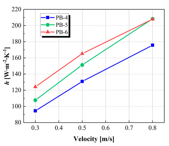 At specific inlet velocities, the heat transfer coefficient increases with the D/d ratio. This increase is likely due to the diversified flow paths and a more uniform heat distribution at larger ratios. However, when the velocity reaches 0.8 m/s, the heat transfer coefficient of PB−6 is 207.9 W∙m−2∙K−1, slightly lower than the 208.3 W∙m−2∙K−1 of PB−5 model at the same inlet velocity, despite the high D/d ratio. This discrepancy might be attributed to the large fluid channels present in the PB−6 model at high inlet velocities, which, as previously analyzed, can lead to uneven heat distribution in the packed bed, negatively affecting the overall heat transfer efficiency. With increasing inlet velocity, these large channels might exacerbate this effect, leading to a reduction in heat transfer efficiency. This unexpected result suggests that merely increasing the D/d ratio does not always guarantee improved heat transfer efficiency; instead, it depends significantly on the internal flow characteristics of the bed.