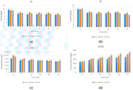 As a result of HC, destruction of complex organic compounds expressed as COD, TOC and TS was found. Regarding the first parameter, as the testing time increased, a decrease in the COD content was observed (Figure 2c). Importantly, at 5 bar, major decreases of COD content that varied between 15–35% were found. A minor effect was achieved at pressures of 3 and 7 bar, respectively. At the lowest pressure, COD was reduced by 14–21% as compared to the untreated sample. In turn, at the highest pressure, decreases of COD content reached 11–24%.